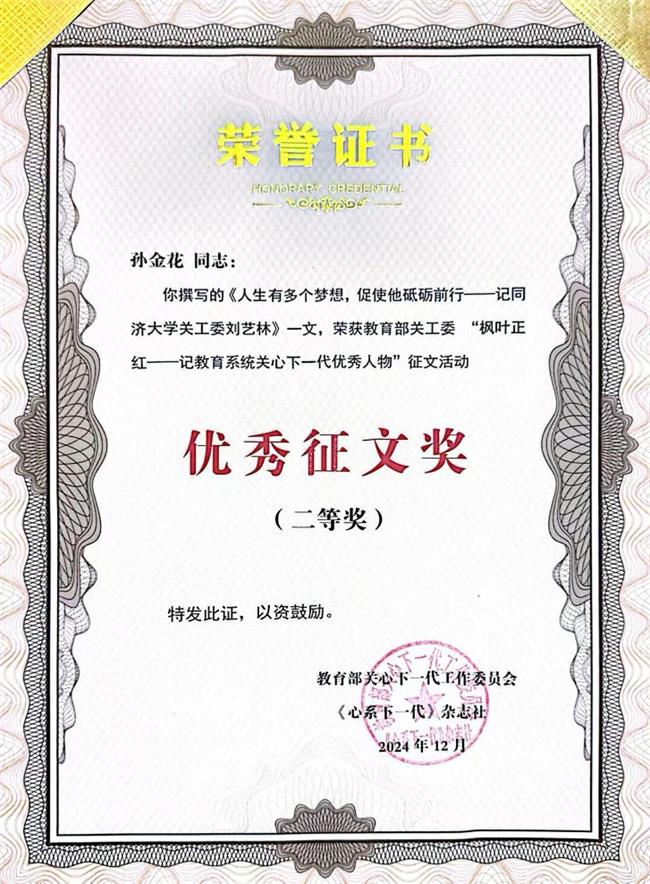 我公司董事长撰写的《人生有多个梦想,促使他砥砺前行--记同济大学关工委刘艺林》一文,荣获教育部关工委“枫叶正红--记教育系统关心下一代优秀人物”征文活动优秀征文奖(二等奖)。